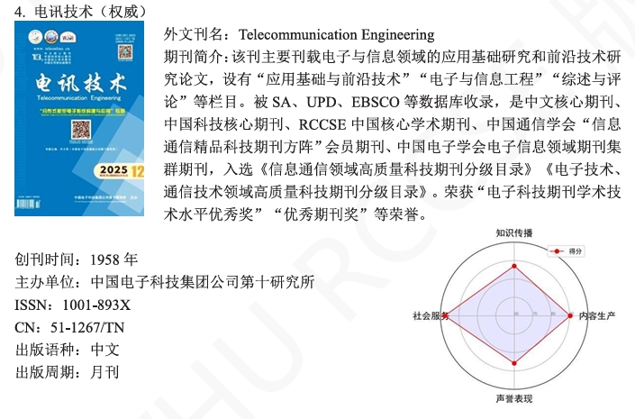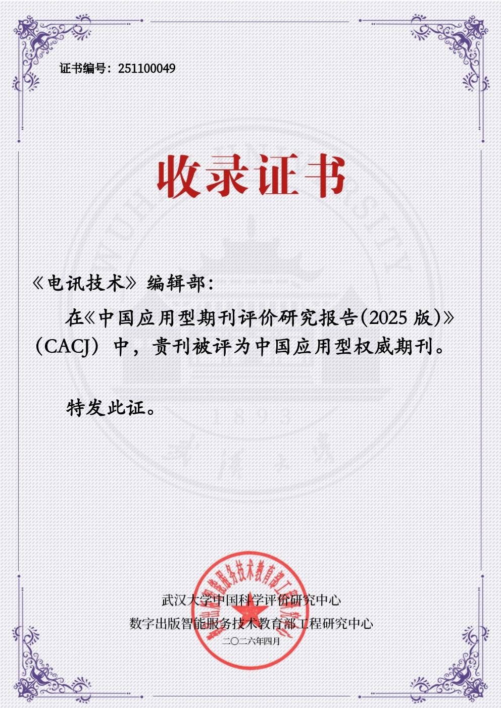 近日,由武汉大学中国科学评价研究中心、数字出版智能服务技术教育部工程研究中心联合研制的《中国应用型期刊评价研究报告(2025 版)》正式发布。《电讯技术》凭借优质的学术质量、突出的应用价值和持续的行业影响力,再次入选电子与信息领域中国应用型权威期刊。《电讯技术》在《中国应用型期刊评价研究报告(2023 版)》(详见《中国应用型期刊评价研究报告(2023版)》正式发布!)中即获评该体系首次评价最高等级。